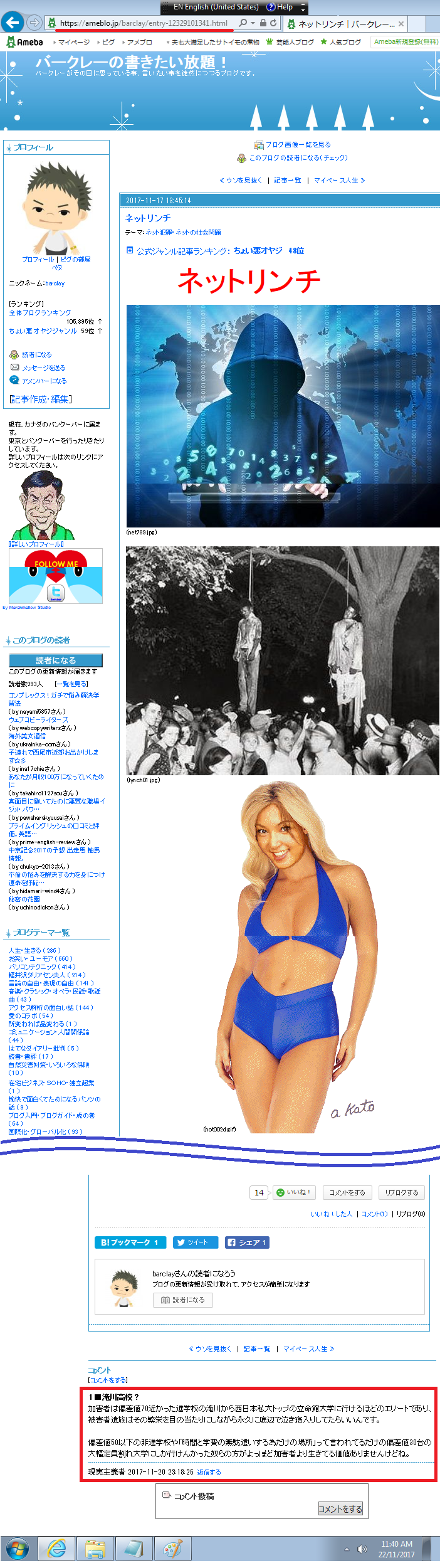 あのねぇ~、テレビを見ていたら“ネットリンチ”にあって自殺した人がいるのですよ。